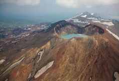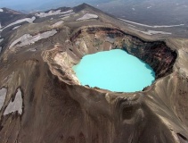 Спектакуларно вулканско езеро во кратерот на вулканот Maly Semiachik во Русија. Температурата на водата се движи од 25°C до 66°C